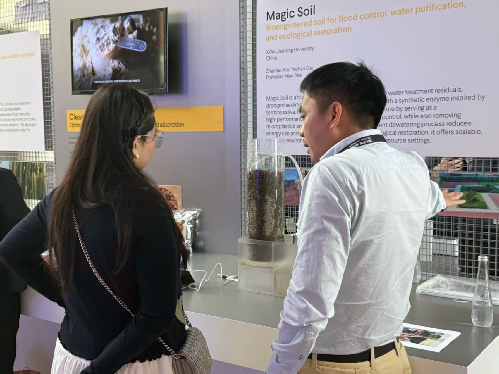谢振涛在西安交通大学客座教授余年与人居学院罗冬副教授的指导下开展“Magic Soil”项目研究。团队基于自然解决方案理念,研发出新型功能性矿质材料,在雨水净化、城市内涝防治及生态修复等应用方向展现出显著优势。