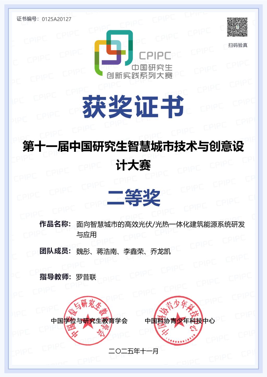 11月8日至10日,由教育部学位管理与研究生教育司指导,中国学位与研究生教育学会和中国科协青少年科技中心主办,由武汉大学、江岸区人民政府、江汉区人民政府、江夏区人民政府承办的“江城杯”第11届中国研究生智慧城市技术与创意设计大赛在武汉大学举行。大赛以“创意启迪智慧、创新驱动发展”为理念,围绕智慧城市主题,激发研究生创新意识,提高研究生创新和实践能力,为国家、社会和企业培养创新型人才。西安交通大学人居学院研究生魏彤、蒋浩楠、李鑫荣、乔龙凯组成的参赛团队在全国255所高校的2335支团队中脱颖而出。在罗昔联教授的指导下,团队凭借作品《面向智慧城市的高效光伏光热一体化建筑能源系统研发与应用》荣获全国二等奖,充分展现了人居学院在智慧城市与建筑能源技术领域的创新实力与科研水平。