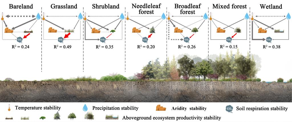 图3 不同生态系统类型中地上与地下稳定性耦合及气候调节作用