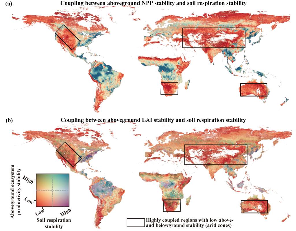 研究还发现旱区具有更强的地上与地下稳定性耦合关系。中亚、澳大利亚中部、美国中西部和非洲南部等地区,虽然地上和地下生态过程本身的稳定性相对较低,但两者之间的联系更为紧密。这说明在水分和养分受限条件下,植被生产过程与地下土壤过程之间具有更高的相互依赖性,一旦受到持续干旱、土地利用变化或过度放牧等扰动,生态系统功能更容易出现同步下降。这一发现进一步凸显了加强旱区生态系统稳定性研究与风险识别的重要性。