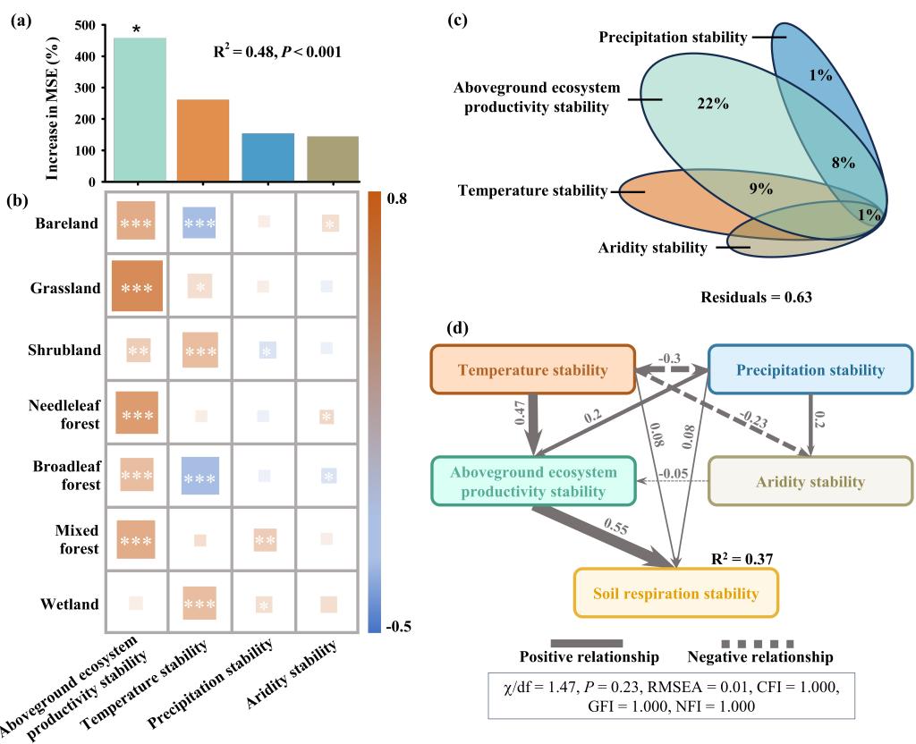 团队采用净初级生产力、叶面积指数、归一化植被指数、增强型植被指数、太阳诱导叶绿素荧光和地上生物量周转率等多源植被指标,系统表征地上生态系统稳定性,并基于4,544条土壤呼吸观测记录,重建了1985至2018年间1公里分辨率的最新全球土壤呼吸数据集。研究发现,地上生态系统生产力越稳定,地下土壤呼吸的长期稳定性越高,表明地上与地下生态过程并非孤立变化,而是在全球环境梯度下保持紧密耦合。这一关系不仅体现在全球空间格局上,也在基于滑动窗口分析的长时间序列评估中表现出高度一致性。