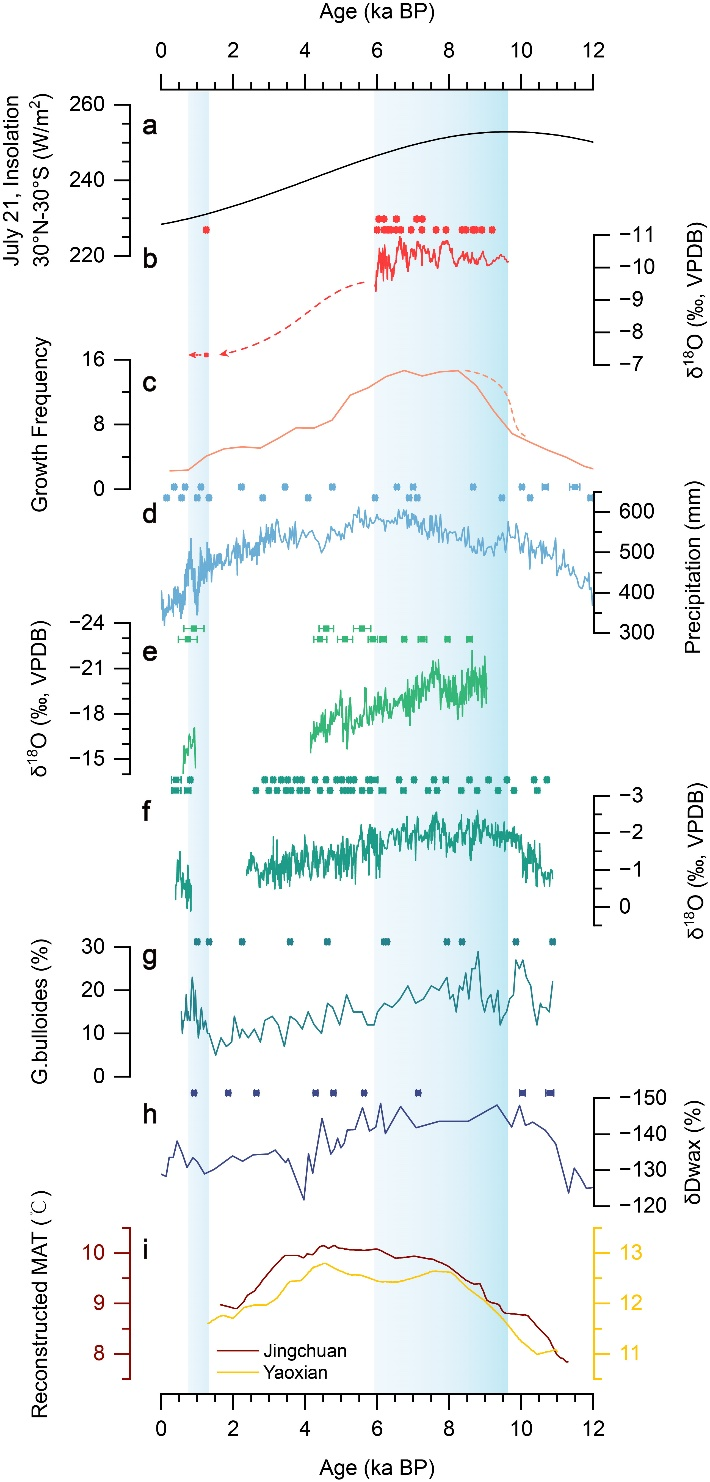 图2 东亚季风边缘带全新世记录对比。(a)夏季南北纬30°太阳辐射梯度差;(b)迤西洞YX-14;(c)龙凤洞石笋生长频率;(d)基于孢粉重建的公海湖降水量;(e)天门洞TM-18;(f)Qunf洞Q5;(g)钻孔ODP-723A;(h)钻孔P178-15P;(i)黄土高原年均温。