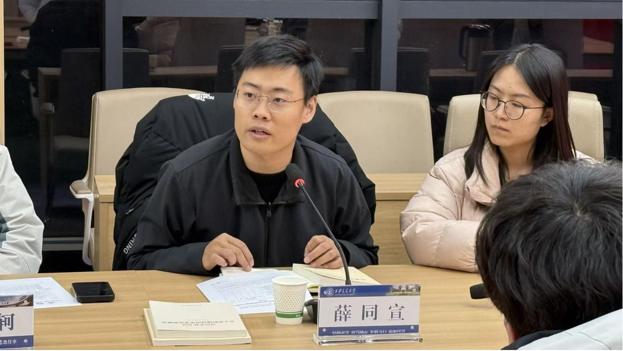 随后,薛同宣对学院2025年度研究生思政教育及日常管理工作进行全面总结。他从思想引领、活动开展、志愿服务、队伍建设等方面梳理了年度工作成果,肯定了各支部在凝聚青年、服务同学方面的积极作为,同时也指出了工作中存在的活动形式创新不足、服务精准度有待提升等问题,并提出了针对性改进建议,为后续研究生思政工作提质增效明确了路径。