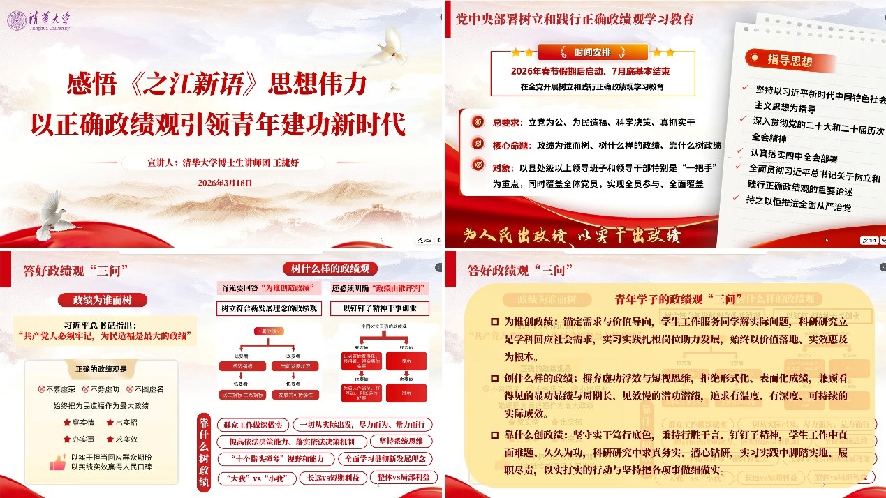 会议首先进行理论学习。支部特邀清华大学博士生讲师团王捷妤作专题宣讲,她立足青年党员成长成才,将《之江新语》中的经典论述与正确政绩观学习教育有机结合,紧扣“立党为公、为民造福、科学决策、真抓实干”16字总要求,系统阐释了正确政绩观的丰富内涵与实践指向。宣讲过程中,王捷妤引导青年党员摒弃虚功浮效与短视思维,拒绝形式化、表面化成绩,在科学研究中求真务实、潜心钻研,实习实践中脚踏实地、履职尽责,以实打实的行动与坚持把各项事做细做实,努力成长为可堪大用、能担重任的青年先锋。