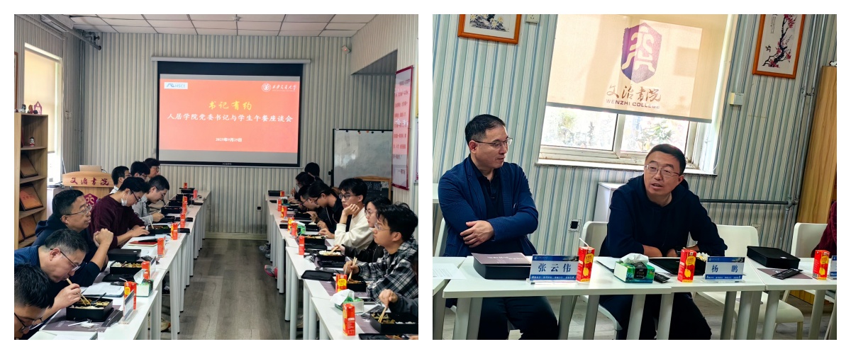 为落实立德树人根本任务,切实发挥党建引领育人实效。9月25日中午,人居学院在文治书院学业辅导室举行“书记有约”午餐座谈会。人居学院党委书记杨鹏、主管本科生教学副系主任张云伟、蔡皖龙,大三、大四年级班主任黄晓林、许威、贾国圣、刘登科,本科教务员张峰瑞、张雅妮,文治书院党建辅导员马福龙与人居学院本科生党员共进午餐,共话成长。