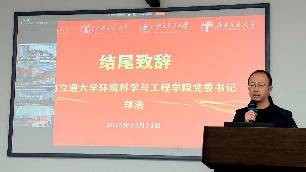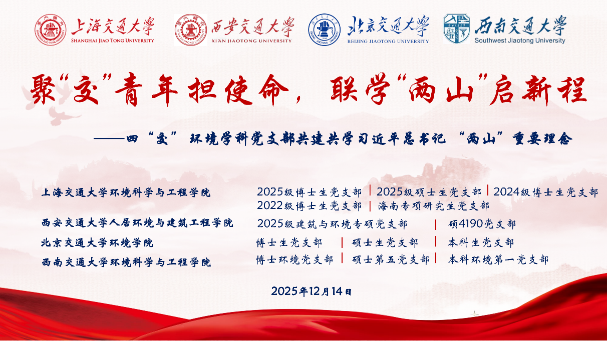 12月14日,四所交大联合开展“聚‘交’青年担使命,联学‘两山’启新程”党建联学共建活动。上海交通大学环境科学与工程学院党委书记郑浩、西安交通大学人居环境与建筑工程学院党委书记杨鹏、北京交通大学环境学院党委书记向宏军、西南交通大学环境科学与工程学院党委书记甘霖出席本次活动,四校13个党支部共计200余名党员参加活动。西安交大线下分会场由人居学院2025级建筑与环境专硕党支部书记张博主持。