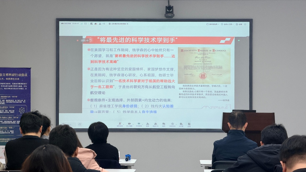会上,上海交通大学钱学森图书馆学术研究部副部长汪长明从历史与科学的双重维度解读了钱学森的传奇人生。他指出,钱学森艰难的归国路折射出其在特殊年代的“特殊价值”,正如周恩来总理所言,他的归来使中美会谈具有了实质意义。汪长明用“三段论”概括了钱老从技术科学、工程技术到基础科学体系的学术跃迁,并强调了其“理论联系实际”的方法论贡献。最后,他以钱学森的三句话作结——从早年的“报国宣言”,到中年的“归宿在中国”,再到晚年“需要更多钱学森”的期许,号召全体环境学子传承老一辈科学家的红色基因,投身国家生态文明建设。