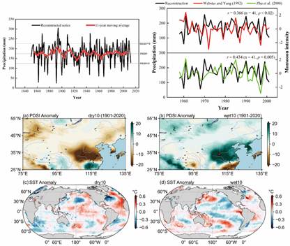 图2过去163年降水量变动情形;重建降水量与季风强度指数的对比;东秦岭地区极端干年与湿年对应的同期海温分布。