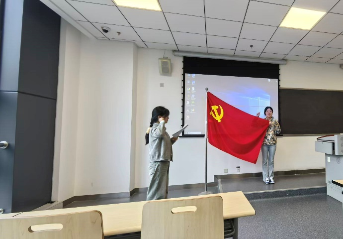 会议第一项议程,讨论和表决关于接收预备党员的事宜。发展对象贺梅同志向大会汇报了自己对党的认识、入党动机以及考察期内的思想动态与学习工作情况,表达了成为一名共产党员的坚定决心。与会党员同志对其在思想、学习和生活等方面的表现进行了充分讨论,一致肯定了贺梅同志的优点和取得的成绩,也指出了贺梅同志存在的不足和今后努力的方向。经支部大会无记名投票表决,全体与会党员一致同意接收贺梅同志为中共预备党员。随后,在支部博士生党小组组长王路同志的带领下,贺梅同志面向党旗、高举右拳,庄严宣誓。