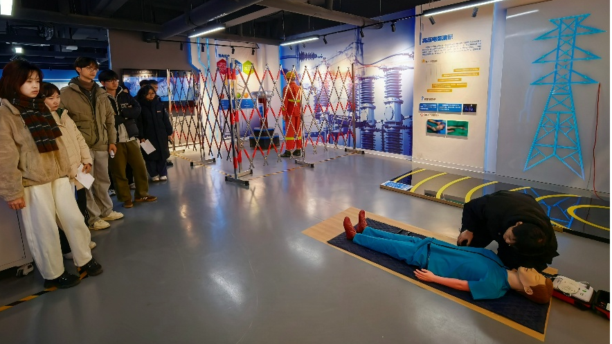 机械动力安全体验区内,专业老师向同学们演示了压力机伤害安全体感装置。同学们在近距离观察后纷纷表示今后在接触大型设备时一定心存敬畏、操作有度;在电与辐射安全体验区,王晓同学代表大家深度参与高压电弧演示、跨步电压安全体感等项目,同学们现场学习了触电急救的关键步骤。